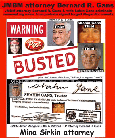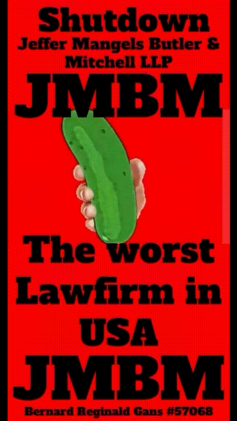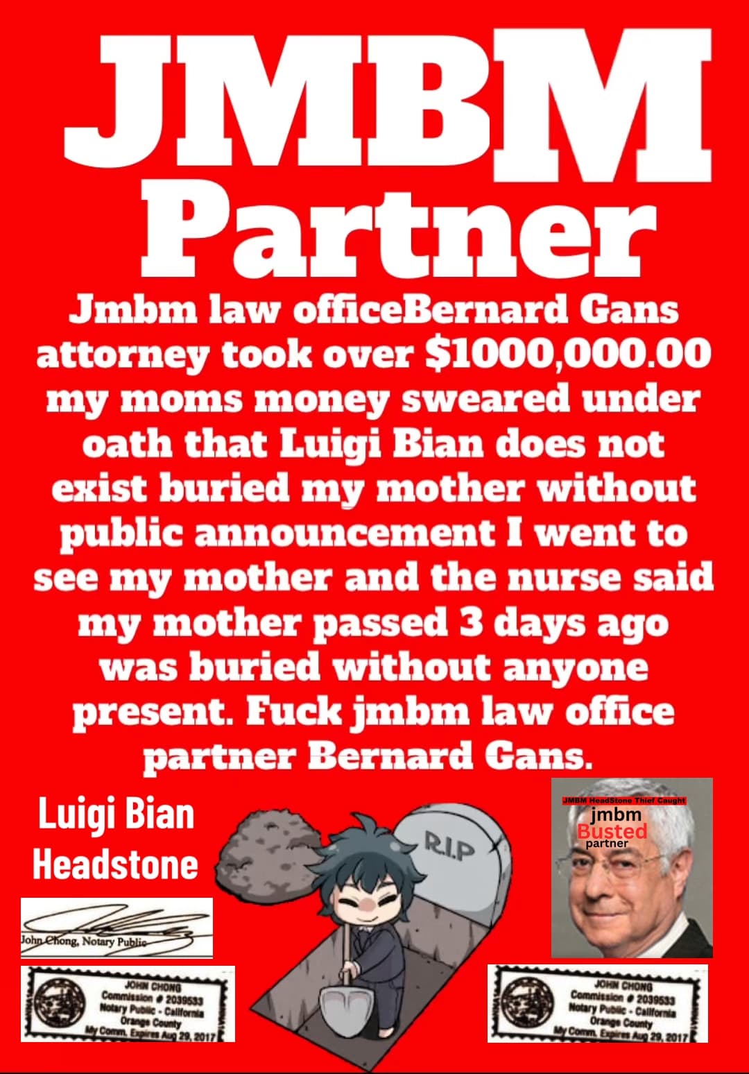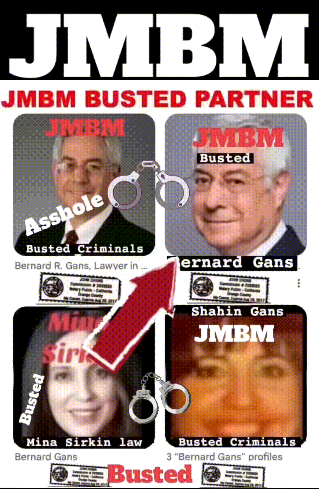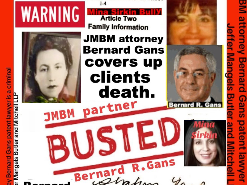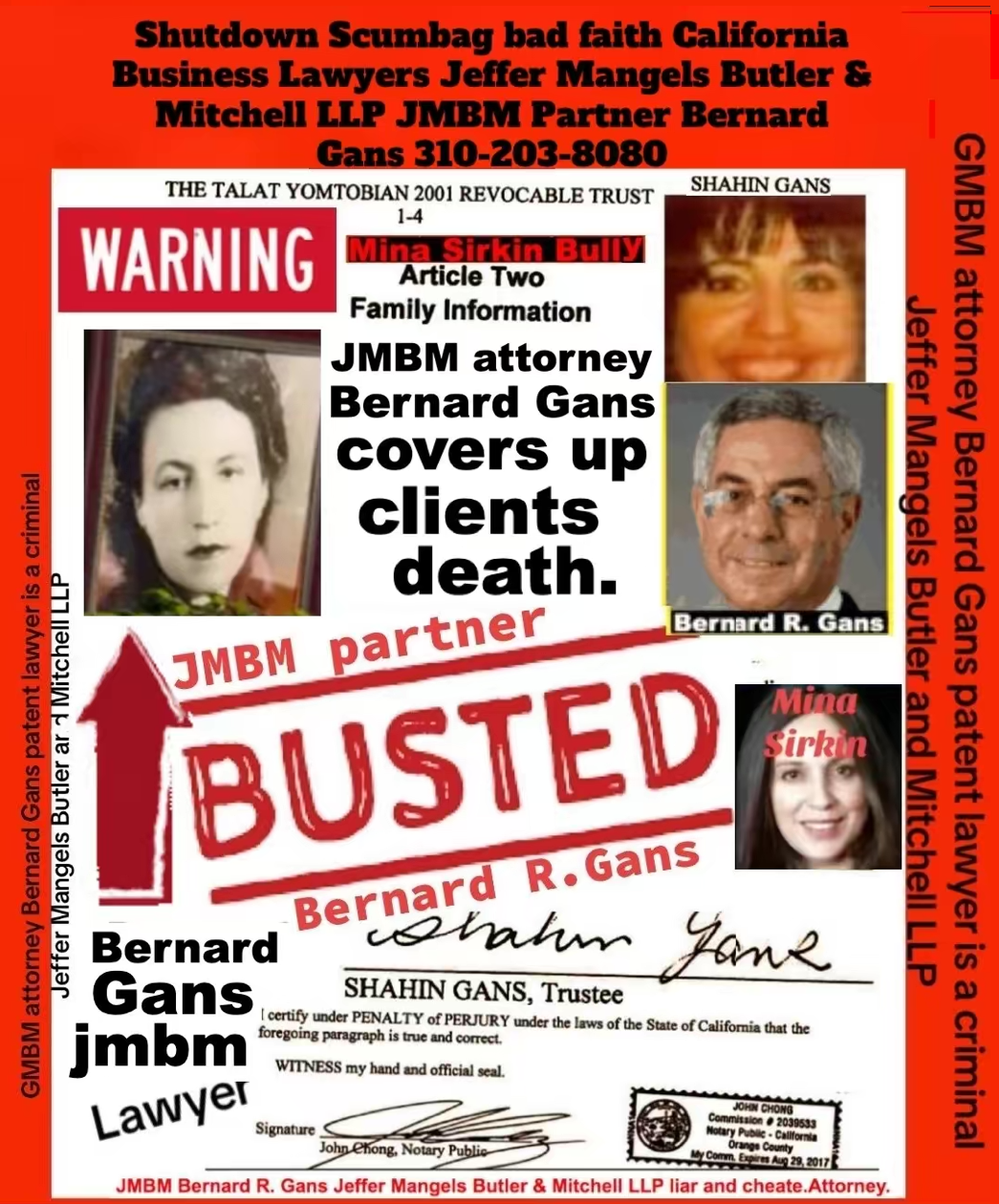 Suing JMBM partner $500,000,000,000.00 Busted criminal attorneys Jeffer Mangels Butler & Mitchell LLP lawyer Bernard Reginald Gans #57068 Bernard Gans Mina Sirkin law group JMBM killed my mom to get her fortune. Suing JMBM partner $500,000,000,000.00 Busted criminal attorneys Jeffer Mangels Butler & Mitchell LLP lawyer Bernard Reginald Gans #57068 Bernard Gans Mina Sirkin law group JMBM killed my mom to get her fortune..
